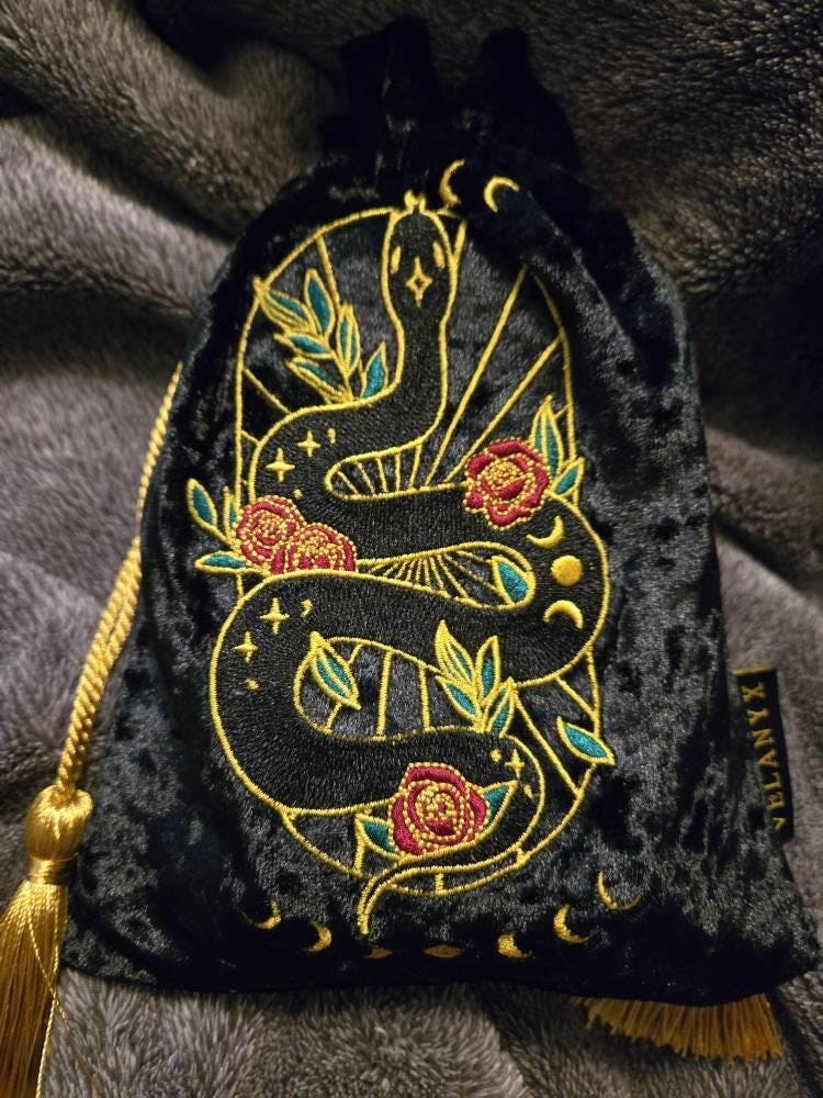 This sophisticated pouch features stunning line artwork of a snake entwined with roses, framed by enchanting moon phases above and below. Perfect for holding your tarot cards, crystals, or other cherished items, this exquisite bag combines artistry with practicality. Made from velvet with a silky satin lining, it includes a secure drawstring closure to keep your treasures safe and ready for any occasion. Embrace the mystique and allure of this captivating pouch!